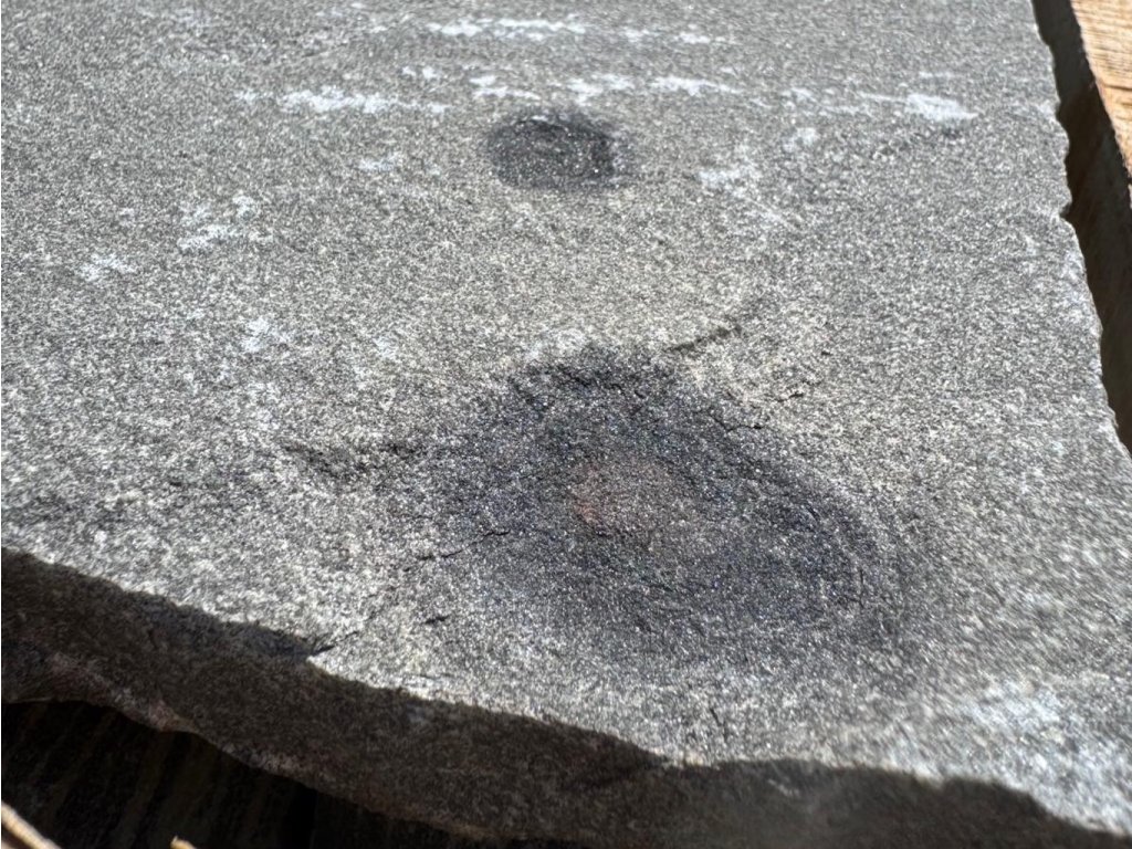 POZOR: U tmavých až černých odstínů indického pískovce se mohou ojediněle objevit tmavé skvrny (fleky). Jsou to přírodní manganové nebo železité inkluze (tzv. „mangan spots“), u indického pískovce je to poměrně běžný jev — během vzniku kamene se do něj dostaly drobné shluky minerálů (hlavně oxidů manganu nebo železa), které jsou odolné a tmavší než okolní materiál.